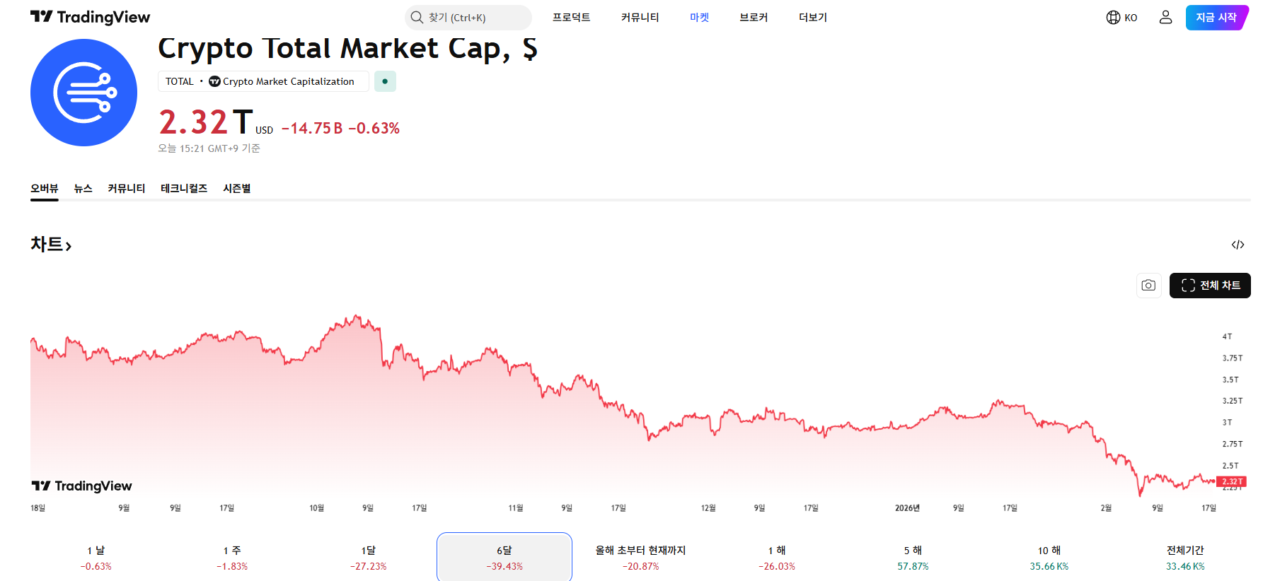 비트코인만의 문제가 아닙니다. 암호화폐 시장 전체 시가총액이 고점 대비 약 2조 달러 감소했습니다. 이는 시장 전반적인 신뢰도 하락을 의미하며, 알트코인들의 동반 하락으로 이어지고 있습니다.